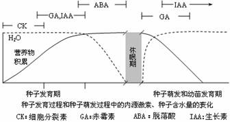 下图为种子发育过程和种子萌发过程中内源激素、种子含水量以及营养物质积累量的变化,据图分析,在种子发育过程中有关植物激素的作用不正确的是 C