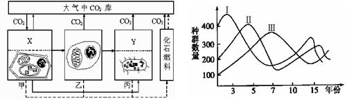 23. 下面的左图为生态系统的碳循环示意图,其中甲、乙、丙表示生态系统中的三种成分;右图曲线表示某生态系统中3个不同种群的生长和繁衍情况,且已知种群Ⅰ为自养生物,三个种群间存在捕食关系。以下说法正确的是 ( D )