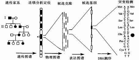 Ⅱ 某些遗传病具有家族性遗传的特征,非家族成员一般也非携带者。下图为80年代开始采用的“定位克隆法”示意图,通过对家系分析将与某种疾病相关的基因定位在某一染色体的特定部位。(表示氨基酸的三字母符号:Met-甲硫氨酸;Val-缬氨酸;Ser-丝氨酸;Leu-亮氨酸;Gln-谷氨酰胺;Pro-脯氨酸;Cys-半胱氨酸)请据图回答问题:![]()