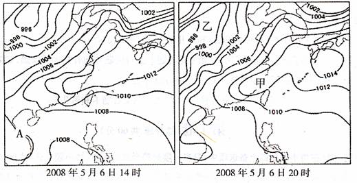 A.甲地为海洋,乙地为陆地 B.乙地可能出现阴雨天