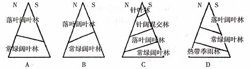 16.今年国庆节期间,烟台的李静到四川峨眉山旅游,回来后绘制了四幅峨眉山的植被分布示意图,你认为正确的是 ( )