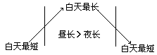 地球昼半球和夜半球的分界线叫晨昏线(圈)。晨昏线把所经过的纬线分割成昼弧和夜弧。由于黄赤交角的存在,除二分日时晨昏线通过两极并平分所有纬线圈外,其它时间,每一纬线圈都被分割成不等长的昼弧和夜弧两部分(赤道除外)。地球自转一周,如果所经历的昼弧长,则白天长;夜弧长,则白昼短。昼夜长短随纬度和季节变化的规律见下表: