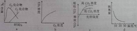 ①图a曲线表示小麦离体叶片光下利用14CO2进行光合作用时14C含量变化的情况 ②图a曲线表示玉米离体叶片光下利用14CO2进行光合作用时14C含量变化的情况 ③图b曲线表示酵母菌随O2浓度增加产生CO2的浓度变化的情况 ④图c曲线表示生态因素对光合作用的影响情况 ⑤图d曲线表示小鼠由30℃→10℃环境耗氧量变化情况 ⑥图d曲线表示青蛙由30℃→10℃环境耗氧量变化情况