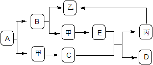 (4分)(2009·雅安)下图是初中化学中常见物质间的转化关系,其中甲、乙、丙为单质;A、B、C、D、E为化合物,且A与B的组成元素相同,D与E的组成元素也相同。已知C、丙均为黑色粉末,C和E在高温条件下可生成丙和D,D能使澄清的石灰水变浑浊。其余反应条件、部分反应物和生成物均已略去。试推断: