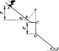 (9分) 山地滑雪是人们喜爱的一项体育运动.一滑雪坡由AB和BC组成,AB是倾角为37°的斜坡,BC是半径为R=5m的圆弧面,圆弧面和斜面相切于B,与水平面相切于C,如图所示,AB竖直高度差hl=8.8m,竖直台阶CD高度差为h2=5m,台阶底端与倾角为37°的斜坡DE相连.运动员连同滑雪装备总质量为80kg,从A点由静止滑下通过C点后飞落到DE上(不计空气阻力和轨道的摩擦阻力,g取10m/s2,sin37°=0.6,cos37°=0.8).求: