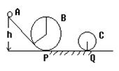 9.如图所示,一小球自斜轨高为h的A点由静止开 始滚下,经过大圆轨道水平轨道PQ后,接着沿半径r=2.4m的小圆轨道做圆周运动。设大圆轨道半径为2r ,除小球与水平轨道间的摩擦系数u=0.1外,其余阻力均不计,小球通过两圆最高点B、C时对轨道的压力