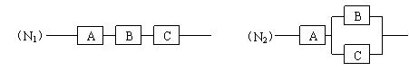 例3 (2000年新课程卷第18题)用A、B、C三类不同的元件连接成两个系统N1、N2.当元件A、B、C都正常工作时,系统N1正常工作,当元件A正常工作且元件B、C至少有一个正常工作时,系统N2正常工作.已知元件A、B、C正常工作的概率依次为0.80,0.90,0.90,分别求系统N1、N2正常工作的概率.