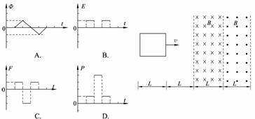 如图所示,两个有界匀强磁场,磁感应强度大小均为B,方向分别垂直纸面向里和向外,磁场宽度均为L,距磁场区域的左侧L处,有一边长为L的正方形导体线框,总电阻为R,且线框平面与磁场方向垂直,现用外力F使线框以速度v匀速穿过磁场区域,以初始位置为计时起点,规定:电流沿逆时针方向时的电动势E为正,磁感线垂直纸面向里时磁通量Φ的方向为正外力F向右为正。则以下关于线框中的磁通量Φ、感应电动势E、外力F和电功率P随时间变化的图象正确的是