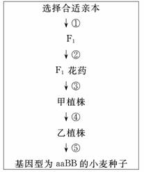 (2) 某同学设计了培育小麦矮杆抗病新品种的另一种育种方法,过程如右图所示。其中的③表示 技术,④应在甲植株生长发育的 时期进行处理;乙植株中矮杆抗病个体占 。
