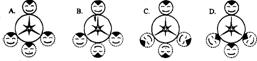例5.一电动玩具的正面是由半径为1Ocm的小圆盘和半径为20 cm的大圆盘依右图方式连接而成的.小圆盘在大圆盘的圆周上外切滚动一周且不发生滑动(大圆盘不动),回到原来的位置,在这一过程中,判断虚线所示位置的三个圆内,所画的头发、眼睛、嘴巴位置正确的是(不妨动手试一试!) ( )
