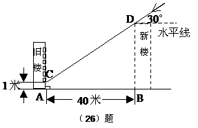 例6.为解决楼房之间的挡光问题,某地区规定:两幢楼房间的距离至少为40米,中午12时不能挡光.如图,某旧楼的一楼窗台高1米,要在此楼正南方40米处再建一幢新楼.已知该地区冬天中午12时阳光从正南方照射,并且光线与水平线的夹角最小为30°,在不违反规定的情况下,请问新建楼房最高多少米?(结果精确到1米.