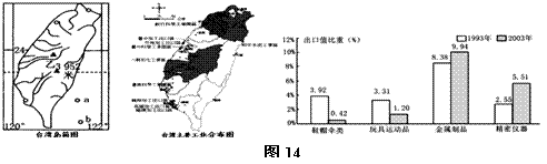 材料二:台湾省1993年和2003年部分出口产品所占比重的统计图