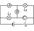 如图所示电路中,A、B、C分别表示理想电流表或电压表,它们的示数以A或V为单位。电键S闭合后,A、B、C的示数分别为1、2、3,灯L1、L2恰好都正常光。已知灯L1、L2的额定功率之比为3∶1。可以判定