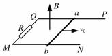 15.如图,光滑的U型金属导轨PQMN水平地固定在竖直向上的匀强磁场中.磁感应强度为B,导轨的宽度为L,其长度足够长,QM之间接有一个阻值为R的电阻,其余部分电阻不计。一质量为m,电阻也为R的金属棒ab,恰能放在导轨之上并与导轨接触良好。当给棒施加一个水平向右的冲量,棒就沿轨道以初速度v0开始向右滑行。求: