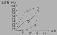 (3)右图为人体大脑、身高体重、生殖器官随人的年龄增长而发育的曲线示意图,其中代表大脑发育的曲线是 。(填图中代号)