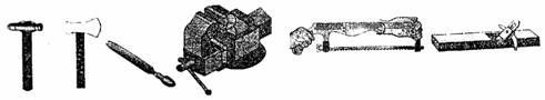 ①锤头 ②斧头 ③锉刀 ④台虎 ⑤钢锯 ⑥刨子