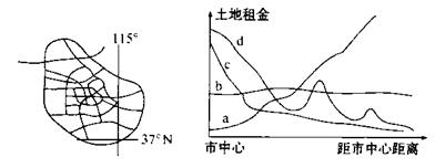 22.下图为我国某城市环形放射道路示意图和距市中心距离土地租金变化示意图,图中能正确表示从市中心到城市外缘地租水平变化趋势的曲线是