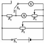 第一步:先将R2的滑动头调到最左端,单刀双掷开关S2向1闭合,闭合电键S1,调节变阻器R1和R2,使电压表和电流表的示数尽量大些(不超过量程),读出此时电压表和电流表的示数U1、I1.