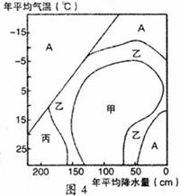 图4为“1950年不同气候条件下的侵蚀强度划分图”,其中甲、乙、丙分别代表大、中、小三种侵蚀强度区域,其中对A区域不作该外力作用强度的划分。据图回答10-11题。