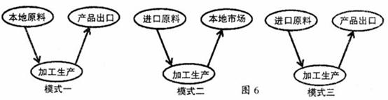 (4)20世纪80年代以来,发达国家将工厂转移到B区,形成了三种生产模式(如图6),请分别写出各自的主导因素。(6分)