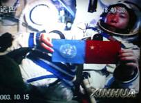 北京时间10月15日18时40分,中国培养的第一位航天员杨利伟从太空向世界各国人民问好,并在舱内并列展示了五星红旗和联合国旗(摄于北京航天指挥控制中心大屏幕)。