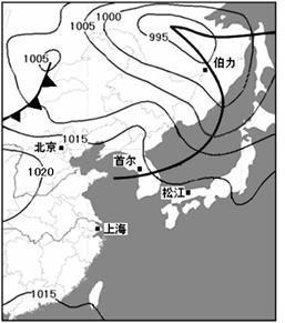 (26分)下图为东亚部分地区地理简图,图中等值线表示2008年11月2日15时(北京时间)东亚地区海平面气压分布状况,黑色粗曲线表示锋面。读图回答下列问题。