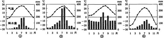 (3)下图四幅气候特征图中分别表示北京和松江的是 和 ,试比较两个城市的气候特征的差异,并简单分析原因。