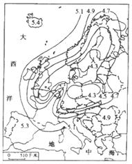 5、读“某年欧洲降水pH值等值线图”分析后,回答下列各小题: