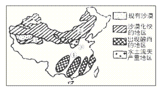 (1)地区沙漠化的自然原因是__________________________________________,地区沙漠化的人为原因是_____________________________________________。为防治西北地区土地的沙漠化,我国正在这些沙漠化严重的地区进行巨大的生态工程是___________________。 (2)地区水土流失严重的原因是_________________________________________________,治理的根本措施是________________________。 (3)地区出现酸雨危害的原因是____________________________________ _ __________________________________________________________________防治酸雨的根本途径是_______________________________________________________________。