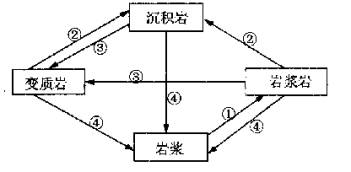 右图中①-④分别代表:①冷却凝固作用;②风化、侵蚀、搬运、沉积和固结成岩等外力作用;③变质作用;④重熔再生