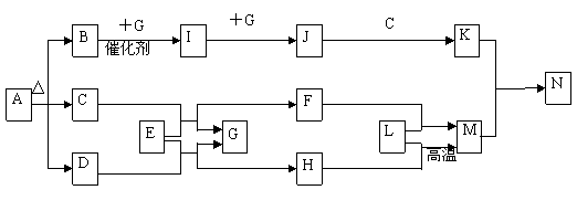 18.(12分)下图中各方框中的字母表示有关的一种反应物或生成物(某些物质略去)其中常温下B、D、G、I、J为气体,其中B可使湿润的红色石蕊试纸变蓝,A-N的所有物质中只有G为单质,其余为化合物。N为不溶于水的无机酸。