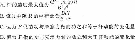 10. 如图所示,固定放置在同一水平面内的两根平行长直金属导轨的间距为d,其右端接有阻值为R的电阻,整个装置处在竖直向上磁感应强度大小为B的匀强磁场中. 一质量为m(质量分布均匀)的导体杆ab垂直于导轨放置,且与两导轨保持良好接触,杆与导轨之间的动摩擦因数为μ. 现杆在水平向左、垂直于杆的恒力F作用下从静止开始沿导轨运动距离l时,速度恰好达到最大(运动过程中杆始终与导轨保持垂直). 设杆接入电路的电阻为r,导轨电阻不计,重力加速度大小为g. 则此过程( )