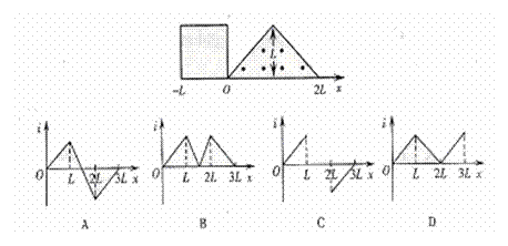等腰三角形内有垂直于纸面向外的匀强磁场,它的底边在x轴上且长为2L,高为L,t=0时刻,边长为L的正方形导线框从图示位置沿x轴匀速穿过磁场,取顺时针方向为电流的正方向,则能够正确表示导线框中电流-位移(i-x)关系的是 ( )