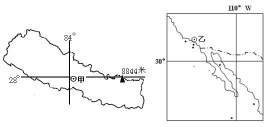 下图中甲、乙是所在国家的两个重要城市,据图中信息,回答下列25-26题。