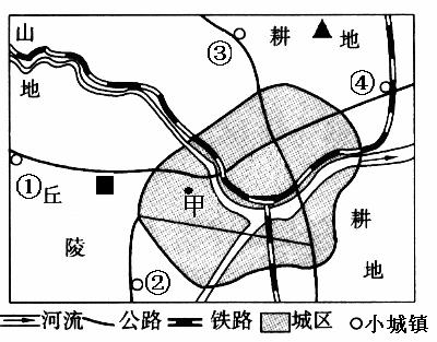 36.城中甲地为一钢铁厂,因城市发展需要,欲将钢铁厂迁往周边小城镇,下列四地中最适宜建钢铁厂的是