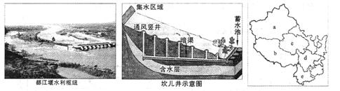 (1)都江堰水利工程位于图中 省级行政区(填字母),坎儿井主要位于图中