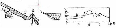 下图中甲是我国东部河流某河段示意图,乙是EF河段河床示意图,丙是河流A、B两水文站测得的水位变化图。据此完成第2-4题。