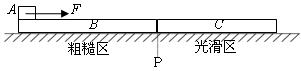 (18分)如图所示,水平面分为两个区,P线左侧为粗糙区,右侧为光滑区.紧靠P线在左侧上放一长L1=1m、质量M1=3kg的长木板B,在右侧上放一质量M2=3kg的长木板C.B、C不粘连.在长木板B的左端放一可看作质点的质量m=2kg的小木块A.已知B与A、B与水平面、C与A之间的滑动摩擦因数均为μ=0.2.现给A施加一个F=8N的水平恒力,经1s后就撤去该恒力.