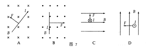 通电导线所受的安培力方向与磁场方向、电流方向都有关系,安培通过大量的实验发现,三者关系可以用左手定则来判定,图7中符合这一关系的有( )