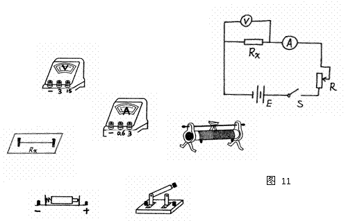 某同学想测量一段金属丝的电阻,实验原理图如图11所示,电压表选用0-3V的量程,电流表选用0-0.6A的量程,请依据原理图将实物用线段连接起来。(用铅笔作图,力求整洁、美观)