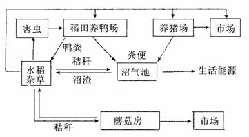 13.右图是我国某地的一个人工农业生态系统模式图,它利用鸭旺盛的杂食性,吃掉稻田里的杂草和害虫,用水稻养猪、养鸭,水稻的秸秆可以培育蘑菇、生产沼气,猪鸭粪、沼渣肥田。请据图分析回答: