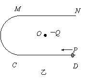 (2)撤去磁场,在MD、NC连线的交点O处固定一电荷量为Q的负电荷,如图(乙)所示,使小球P从D端出发沿杆滑动,滑到N点时速度恰好为零。(已知小球所受库仑力始终小于重力)求: