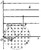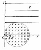 3.(22分)如图所示,真空中有一以(r,0)为圆心,半径为r的圆柱形匀强磁场区域,磁场的磁感应强度大小为B,方向垂直于纸面向里,在y≥r的范围内,有方向水平向左的匀强电场,电场强度的大小为E;从O点向不同方向发射速率相同的质子,质子的运动轨迹均在纸面内. 已知质子的电量为e,质量为m,质子在磁场中的偏转半径也为r,不计重力及阻力的作用,求: