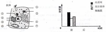 左图表示某淋巴细胞,膜外颗粒为抗体;右图是该细胞在抗体分泌前几种生物膜面积的示意图,请据图回答: