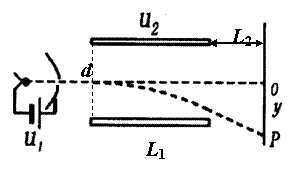 15.(16分)示波器的原理图如图所示.电子经电压为U1的电场加速后,射入电压为U2的偏转电场,离开偏转电场后电子打在荧光屏上的P点,离荧光屏中心O的侧移为y .已知偏转电场极板的长度为L1 ,两板间的距离为d,荧光屏离极板右端的距离为L2,