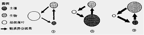 下图是低、中、高三个不同纬度的自然带(生态系统)物质流动示意图。图中圆圈的大小表示所储存养分的多少,箭头的粗细表示物质养分流量的大小。读图判断4-10题。