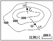 下图为杭州(30°N)某地某座山峰的等高线示意图(单位:米),甲乙为两处风景点,沿虚线L1坡度为30°,沿虚线L2坡度为45°。读图回答6-8题。