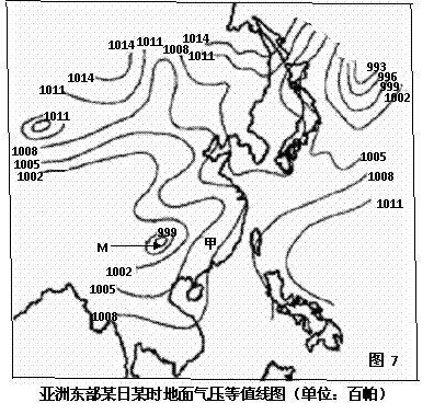 13.甲地此时的风向是 A.东南风 B.西北风 C.西南风 D.东北风 14.关于图中气压状况的叙述,