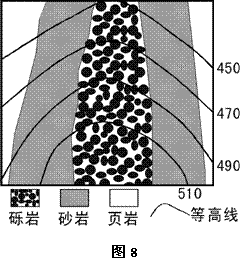 图8中沉积岩的形成符合颗粒大的先沉积,颗粒小的后沉积的规律。图中线段为等高线(单位:米),读图回答15-16题。
