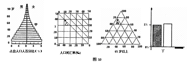 C.丙地人口数量最接近人口合理容量 D.丁地城市化水平高